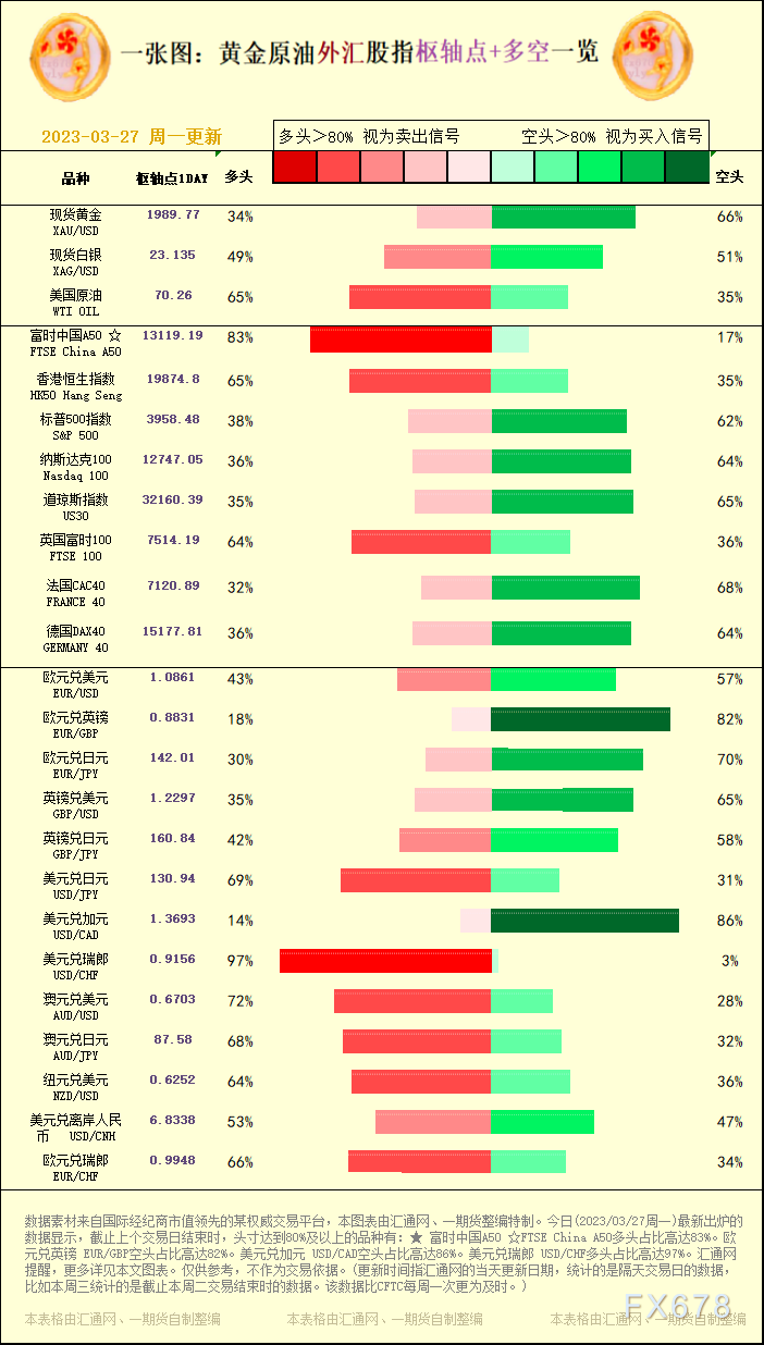 一张图:黄金原油外汇股指"枢纽点+多空占比"一览(2023/03/27周一)