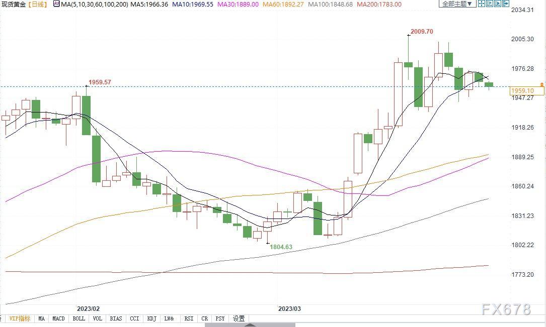 现货黄金日线图北京时间3月30日10:31,现货黄金报1959.05美元/盎司