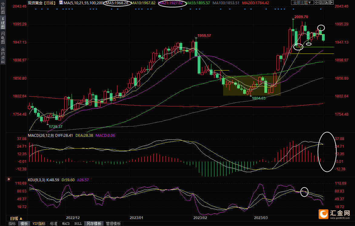日线级别:高位震荡;金价上周五再度冲高回落,周一延续跌势,回落至5日均线和10日均线下方,KDJ死叉信号延续,MACD高位有死叉趋势,红色柱萎缩殆尽,短线偏向空头,初步支撑在1950关口,上周一低点支撑在1943.93附近,较强的支撑参考3月22日低点1934.17附近,21日均线支撑在1927.02附近,若失守该支撑,则增加后市看空信号。