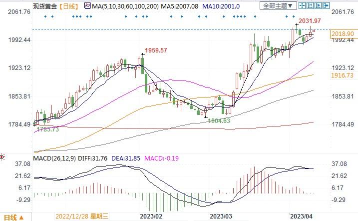 现货黄金日线图北京时间4月13日14:45,现货黄金报2021.64美元/盎司