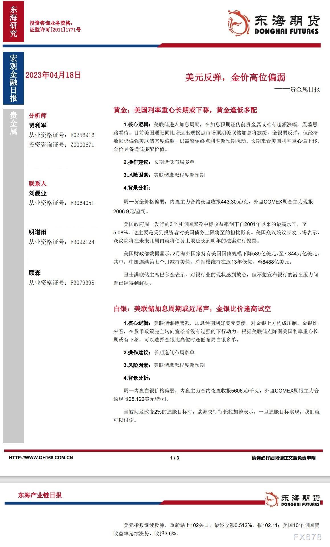 东海期货:美元反弹,金价高位偏弱|黄金 来源:正大期货 作者:正大国际期货 时间:2023-04-18 黄金:美国利率重心长期或下移,黄金逢低多配。 白银:美联储加息周期或近尾声,金银比价逢高试空。 新浪合作大平台期货开户 安全快捷有保障