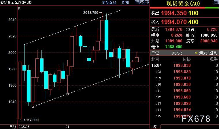 汇通财经APP讯——周二(4月25日),国际金价继续反弹,但幅度不大,谨慎的投资者等待本周即将公布的美国经济数据,以衡量美联储下一步政策举措。金价欲重启涨势须站上2015美元。北京时间15:05,现货黄金上涨0.27%至1994.14美元/盎司;COMEX期金主力合约上涨0.21%至2004.0美元/盎司;美元指数上浮0.13%至101.480。