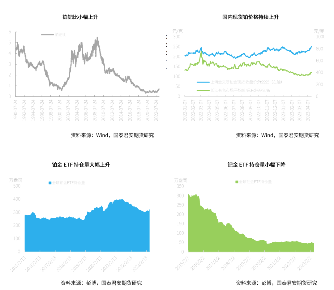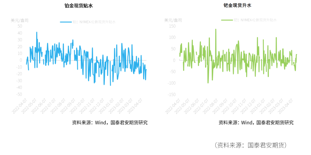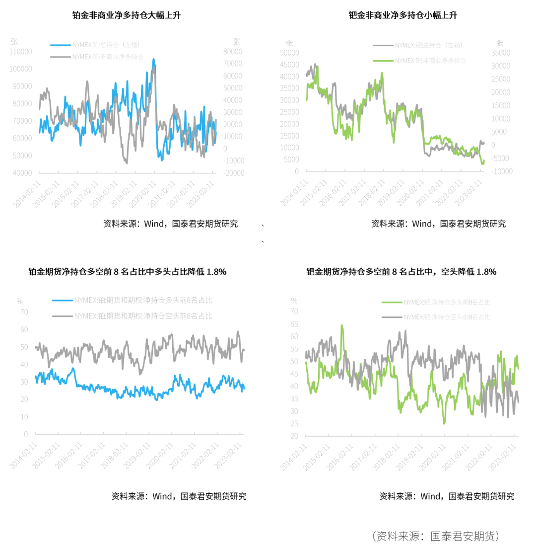 资料来源:Wind,国泰君安期货研究在期货持仓变动方面,截至2023年4月18日,铂金总持仓较上一周呈上升趋势,上升3679张,其中非商业多头方面4月17日当周大幅上升5458张,涨幅为18.46%。非商业净多头持仓增加10986张,呈大幅上升趋势,增幅达82.4%。在净持仓多空前8名占比上,铂金方面净持仓多头占比降低1.8%,空头占比小幅降低0.8%。钯金方面,截至2023年4月18日,总持仓增加442张,其中非商业多头持仓增加449张,空头减少987张,因而非商业净多持仓减少1436张,达20.3%。在净持仓多空前8名占比上,钯金方面多头降低1.2%,空头占比降低1.8%。