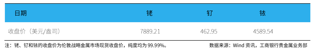 伦敦现货铑(99.99%)收盘价为7889.21美元/盎司,周累计上涨5.34%。
