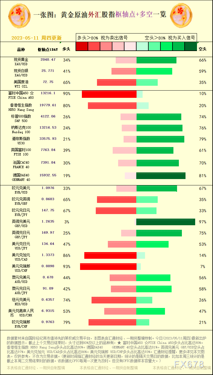 一张图:2023/05/11黄金原油外汇股指"枢纽点+多空占比"一览